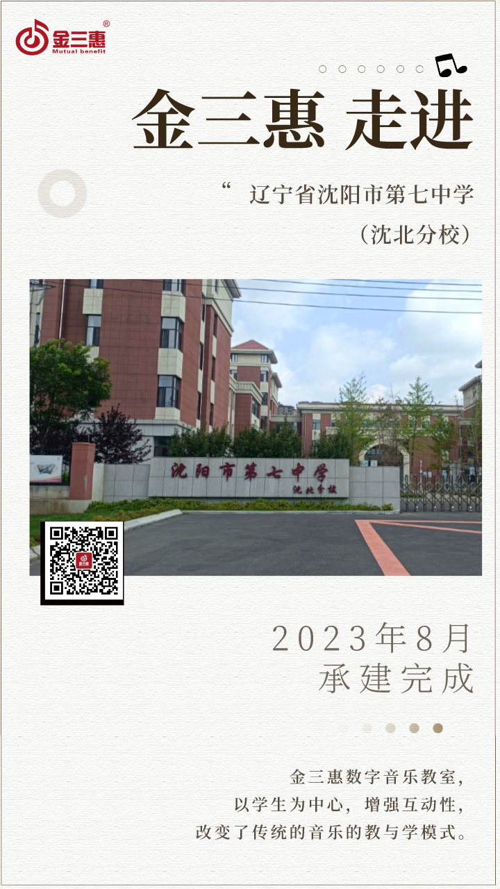 2023年8月,金三惠數字音樂教室為遼寧省沈陽市第七中學(沈北分校)提供、安裝、培訓的24+1智慧創客音樂教室正式開始使用!配備了金三惠教學系統、電鋼琴、數字音樂教學儀等教學教具。