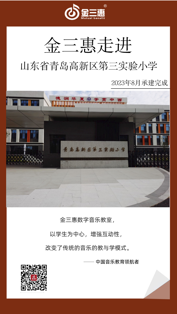 2023年8月,金三惠數(shù)字音樂(lè)教室為山東省青島高新區(qū)第三實(shí)驗(yàn)小學(xué)提供、安裝、培訓(xùn)的23+1智慧創(chuàng)客音樂(lè)教室正式開(kāi)始使用!配備了金三惠教學(xué)系統(tǒng)、電鋼琴、數(shù)字音樂(lè)教學(xué)儀等教學(xué)教具。