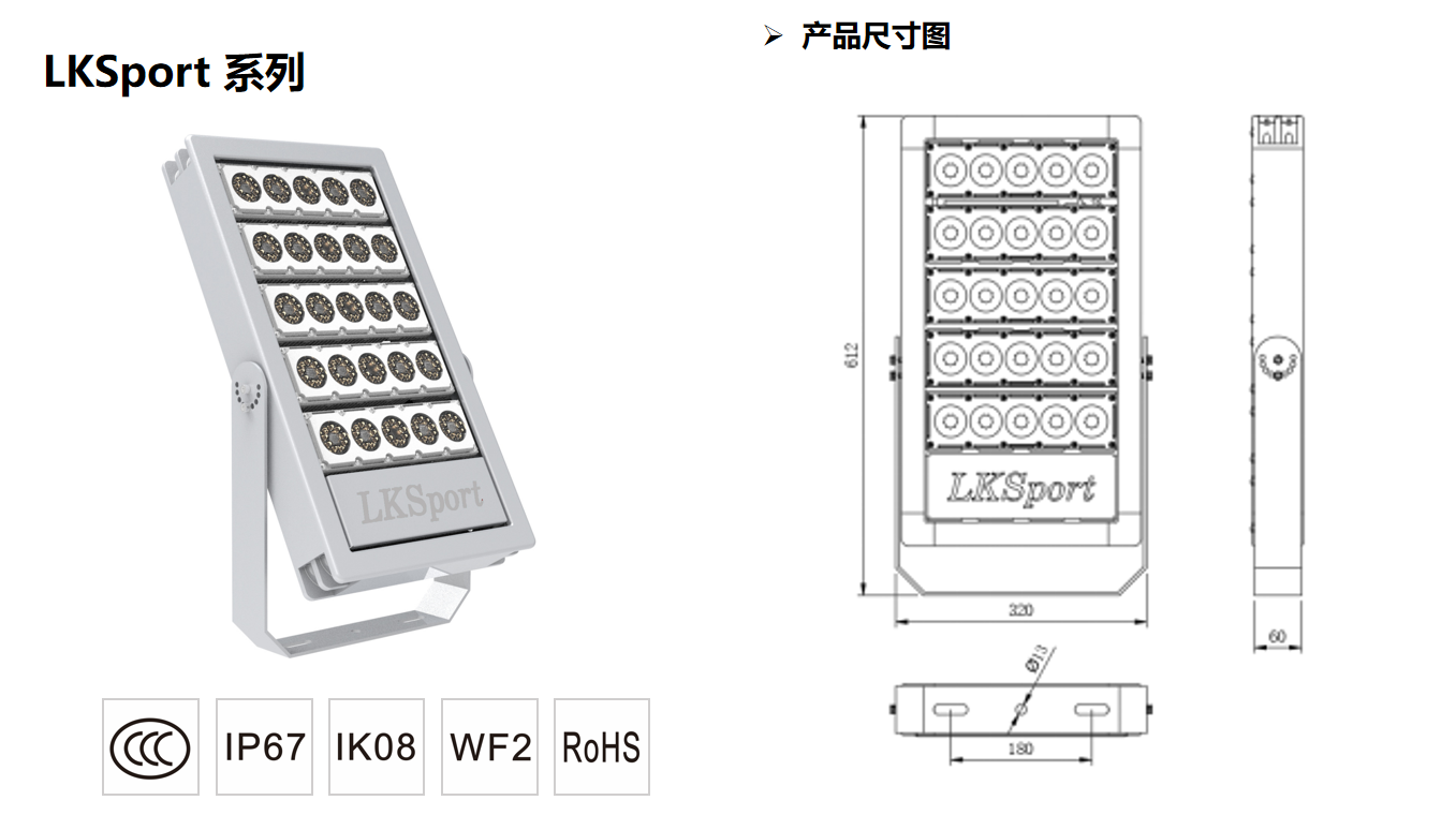 產品詳細介紹產品特點 高顯指,Ra>80 R9>0,滿足各種級別賽事照明需求。 特有的PC級光學材料透鐿,精準配光,有效的抑制眩光與散射光。 精準的防眩光外罩,進一步抵制眩光。 表面噴塑處理,耐腐蝕,耐酸堿。 燈具需使用U型安裝支架,可180°旋轉角度。 防護等級IP67,抗沖擊等級IK08。