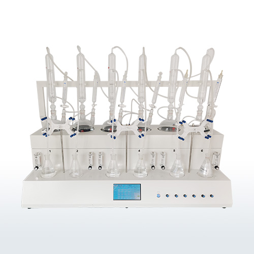 主要特征 1、整機采用PLC控制,性能強勁穩定,7寸液晶觸摸屏,操作簡單易控; 2、采用遠紅外陶瓷加熱碗,貼合度高,集熱性好,加熱效率高,同時有防水和防干燒的設計; 3、每路加熱裝置獨立調控,加熱功率0-500w可調;內置微沸模式,沸騰后自動轉為微沸功率; 4、加熱倒計時功能,單通道時間可任意設定,到點自動停止加熱; 5、標配外接超大制冷量冷卻水循環機,節約用水,適合實驗長時間使用; ☆6、每路采用獨立的轉子流量計控制氮氣流速,流速控制范圍應在50-500ml/min,符合國標要求; ☆7、接收瓶底部內置磁力攪拌器,攪拌速度可單組單調,可無級調速; ☆8、接收裝配標配滴定支架和蝴蝶夾,實驗完成后無需轉移直接進行滴定; ☆9、實驗結束后可選擇冷凝水自動排空功能,防止長期不使用滋生細菌; 10、系統內自帶說明書和服務中心二維碼,手機掃碼自動查看電子說明書和一鍵連接服務中心。