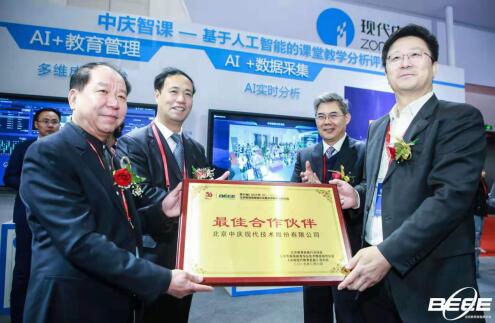 展會首日,北京市高等教育學會會長線聯平、中國高等教育協會秘書長康慨等領導蒞臨中慶展位,考察中慶智能教育的最新應用成果,對中慶將新技術服務教育及對此次展會給予多方支持表示高度肯定并頒發榮譽獎牌。