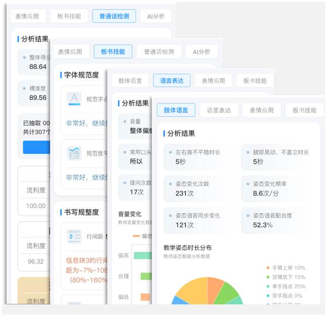 系統(tǒng)從肢體語言、語言表達(dá)、表情應(yīng)用、板書技能、普通話等五項基本技能對教師授課過程進(jìn)行全方位的診斷。每一項基本技能都包含了多個評價指標(biāo),例如:肩部、腿部平穩(wěn)度和姿態(tài)變化,語音、語速、口頭語,表情種類和表情極性,板書的字體規(guī)范、書寫規(guī)整度和色彩應(yīng)用,普通話的流利度、精準(zhǔn)度等等。