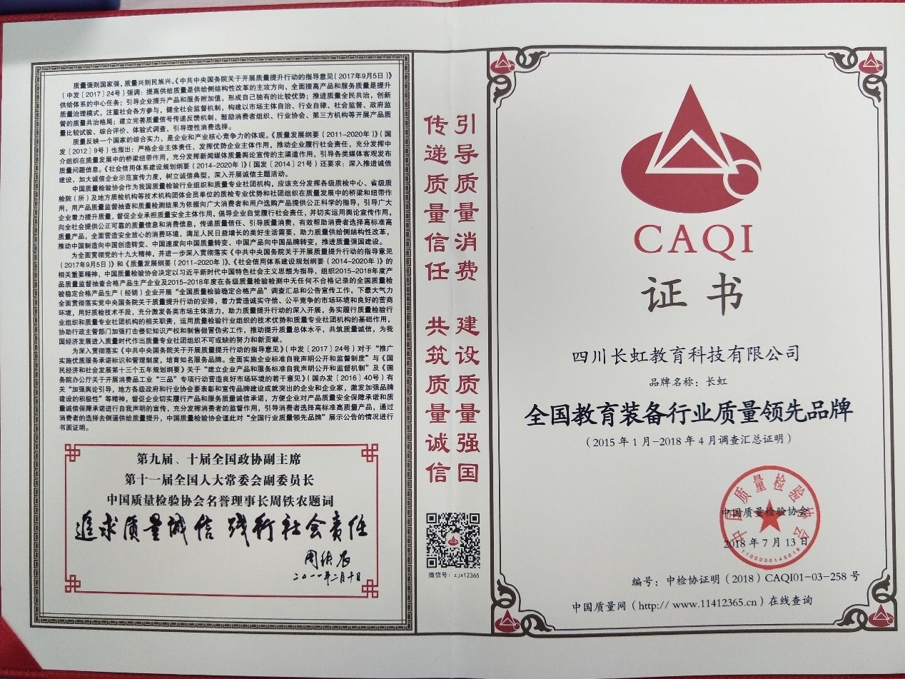 長虹教育公司自成立至今始終秉承工匠精神,堅持生產、銷售高質量教育裝備產品,因此長虹教育的產品質量多次獲得權威機構和市場消費者的認可,這樣的榮譽充分體現了長虹教育產品質量始終保持全國領先地位。