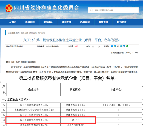 近日,四川省經(jīng)濟和信息化委員會公布第二批省級服務(wù)型制造示范企業(yè)(項目、平臺)名單,四川長虹教育科技有限公司獲得“四川省服務(wù)型制造示范企業(yè)”殊榮,也是該批省級服務(wù)型制造示范企業(yè)中唯一一家綜合性示范模式的企業(yè)。