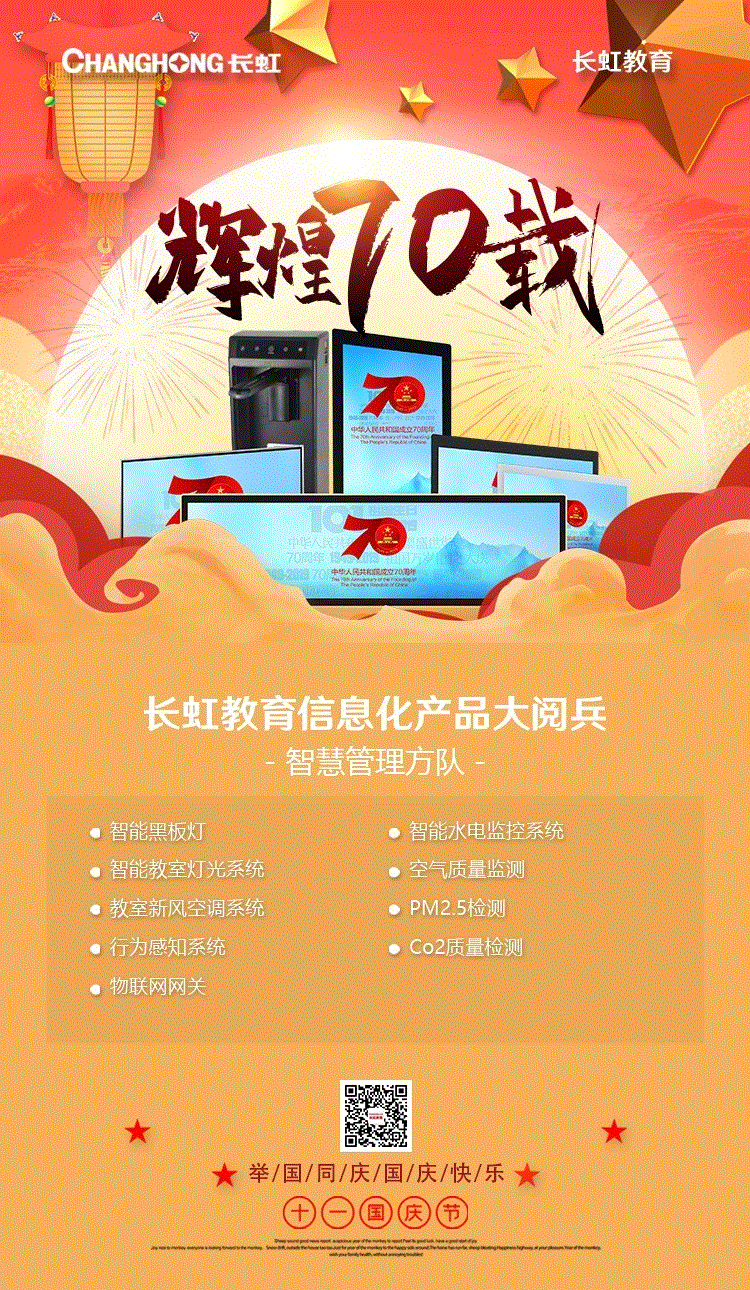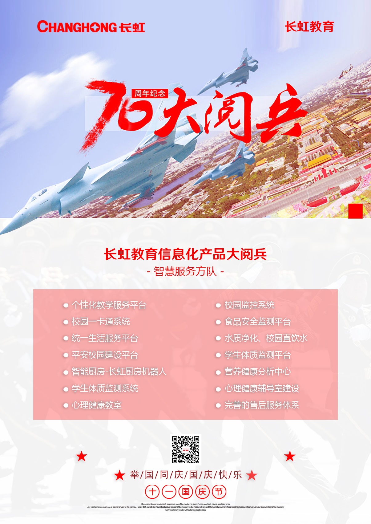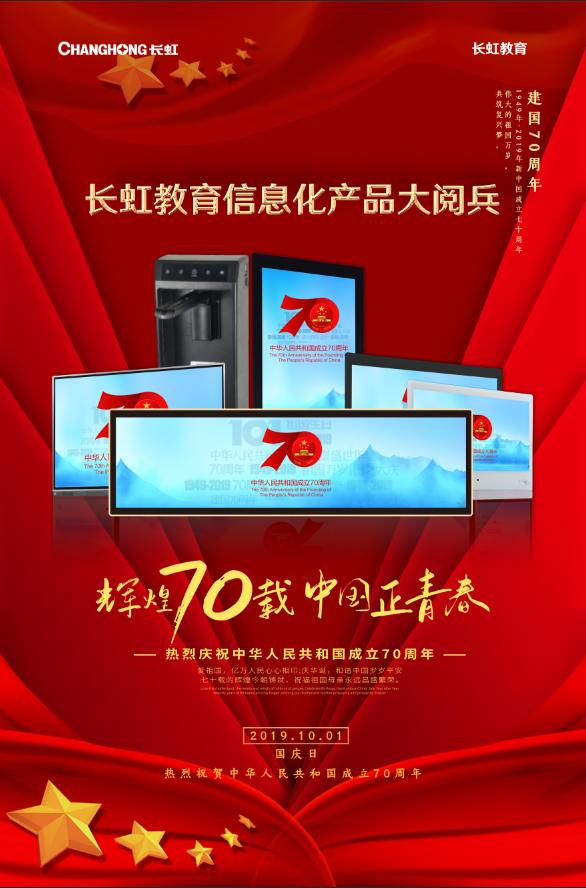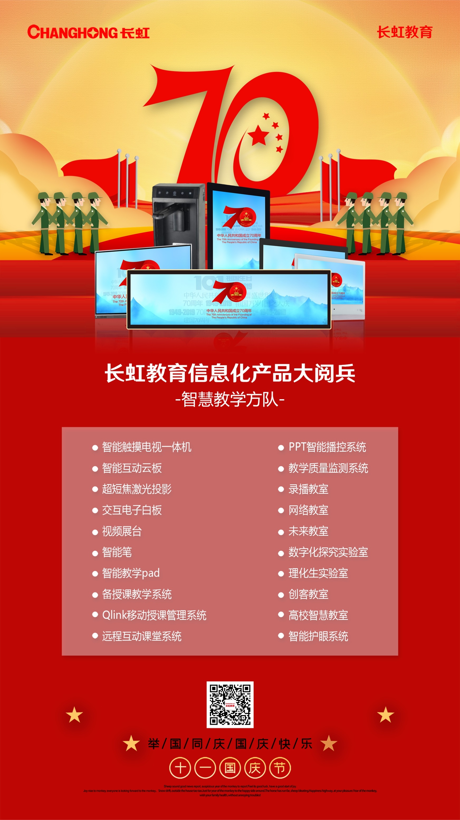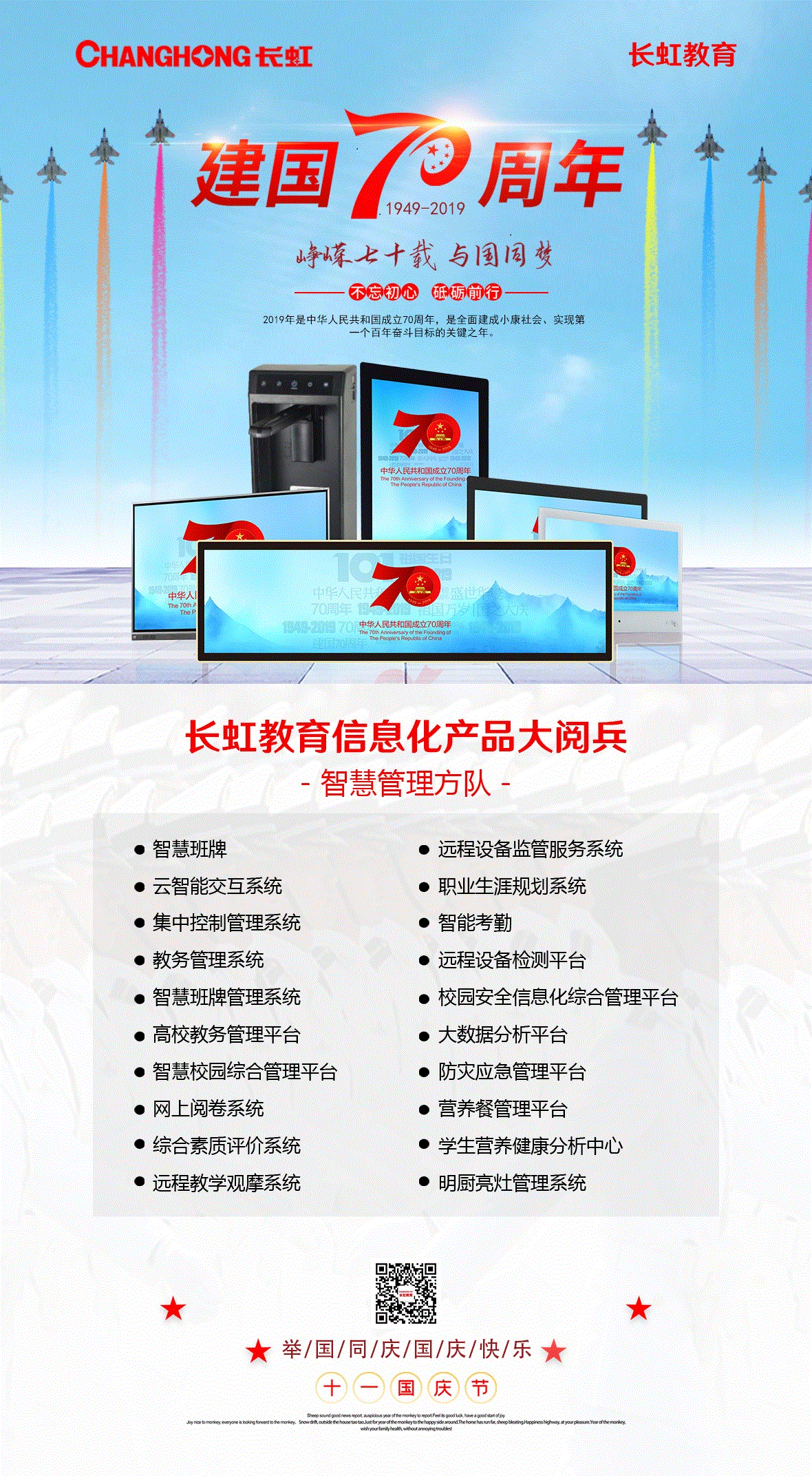 教育興則國(guó)家興,教育強(qiáng)則國(guó)家強(qiáng)70年風(fēng)雨兼程,70年春華秋實(shí),新中國(guó)成立70年來(lái)。中國(guó)教育信息化從"生根發(fā)芽",到"計(jì)算機(jī)的普及要從娃娃做起,"以信息化帶動(dòng)教育現(xiàn)代化到教育信息化2.0新時(shí)代再到如今的5G將顛覆傳統(tǒng)教育方式。長(zhǎng)虹教育公司作為中國(guó)教育信息化領(lǐng)先品牌,在教育信息化路上不斷創(chuàng)新升級(jí)助力各地的教育信息化建設(shè)。新中國(guó)成立70周年生日即將來(lái)臨,長(zhǎng)虹教育公司攜旗下信息化產(chǎn)品方案列隊(duì)閱兵走來(lái)。