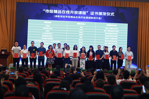市教育技裝中心黨總支書記、市課程協(xié)作組副主任姚友明宣讀了重慶市高校第二批精品在線開放課程認定結果,與會領導一起為獲得市級精品在線開放課程認定的本科及高職的教師代表頒發(fā)了認定證書。