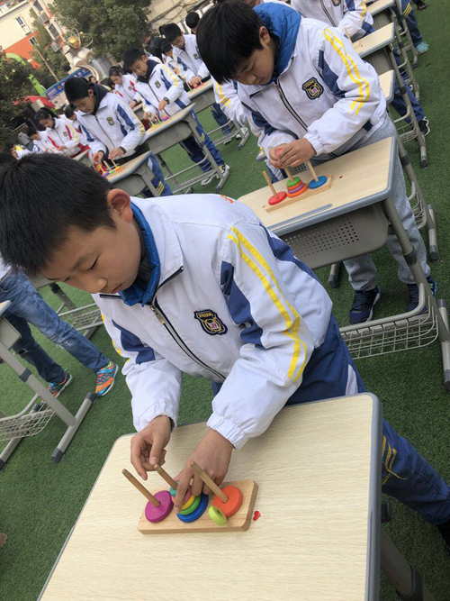 兩節課后,九江小學的孩子們帶來了精彩的益智器具展示,展示項目包括杯子操、華容道、九連環、魔方、漢諾塔等,一個個益智器具在孩子們手上大放異彩,形成一道靚麗的風景。在這里,沒有枯燥的公式,也沒有難解的習題,而是通過“玩”這種最簡單的方式,帶領學生進行思維訓練。在充滿游戲樂趣和緊張思維碰撞的精神活動中挑戰固有的思維定勢,開發學生的智慧潛能。