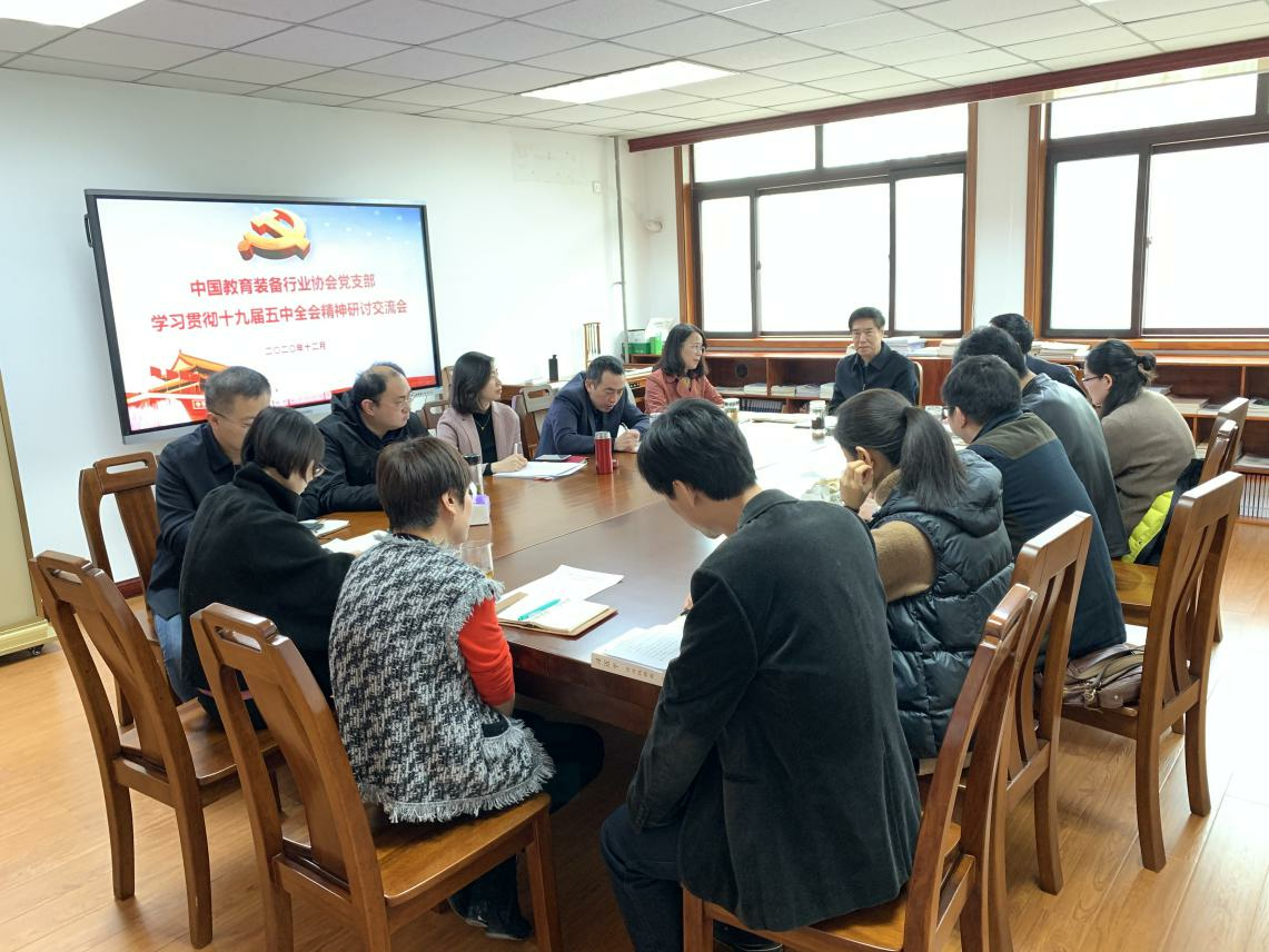黨的十九屆五中全會召開后,中國教育裝備行業協會(以下簡稱協會)黨支部第一時間發出通知,要求全體黨員及時學習,聯系實際,撰寫體會,把學習宣傳貫徹黨的十九屆五中全會精神作為當前和今后一個時期的首要政治任務,切實把思想和行動統一到全會精神上來。在此基礎上,協會黨支部于2020年12月9日召開專題學習研討會,圍繞學習貫徹黨的十九屆五中全會精神進行深入研討交流。