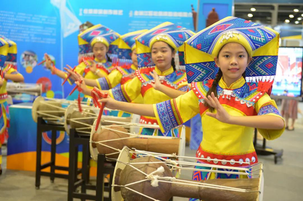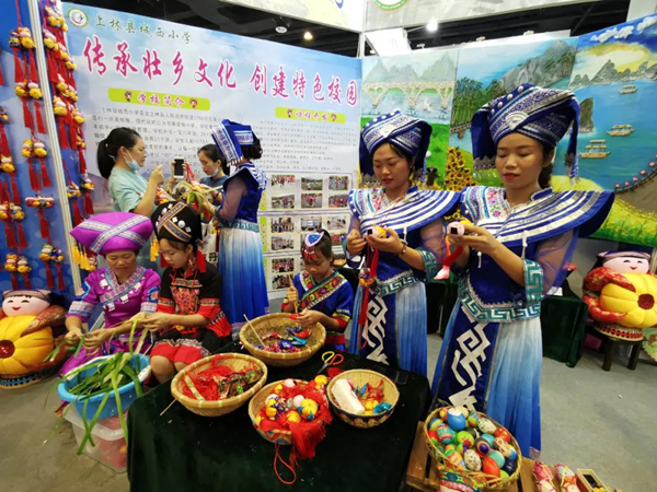 由廣西教育廳主辦的2021廣西中小學創新、特色實驗室優秀案例展區的展位個個都布滿了民族特色,有壯、瑤,苗、侗等多個民族展位,參加本屆優秀案例的縣(區丿學校有49個,布展主要內容有童獅、壯族蜂鼓、侗族木構手工、剪紙、金絲沙畫等民族項目。