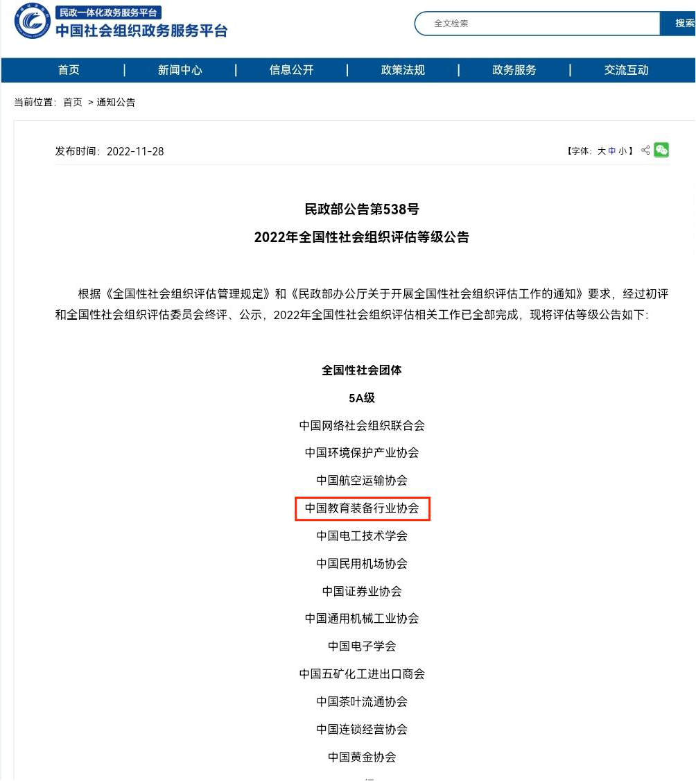 喜報!中國教育裝備行業協會榮獲“5A級全國性社會團體”