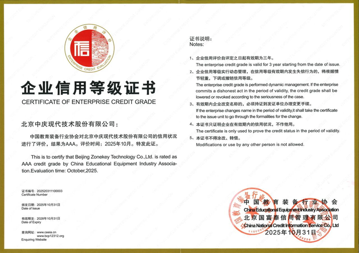 企業信用等級評價是衡量企業綜合信用水平的重要指標,其中AAA評級,是行業內對企業經營狀況、財務信用、管理能力、社會聲譽及履約能力等多個維度進行全面、嚴格評估后授予的最高榮譽,F代中慶連續維持AAA評級,不僅是公司多年來穩健經營、誠信為本的有力證明,更是對公司在教育裝備領域持續創新、優質服務的肯定。
