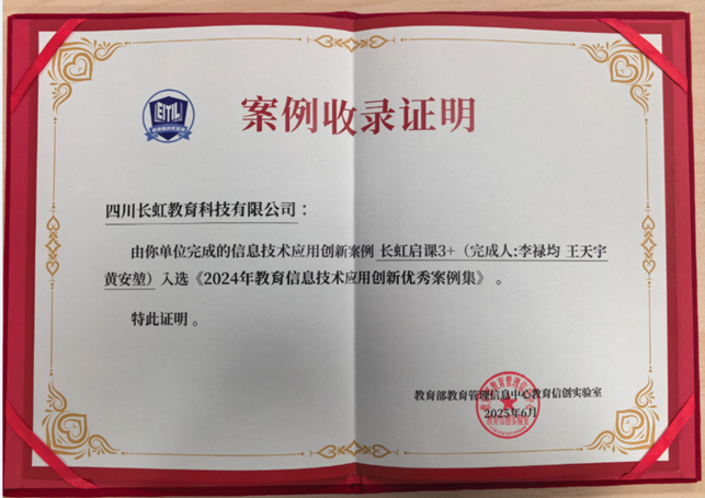 由四川長虹教育科技自主研發的長虹啟課 3+ 教學系統,憑借在教育信創領域的突破性實踐,于2025年11月14日在杭州召開的“教育信息技術應用創新學術研討會”上喜獲教育部教育管理信息中心教育信創實驗室頒發的《2024年教育信息技術應用創新優秀案例集》,成為教育數字化轉型與信創技術融合的標桿典范。