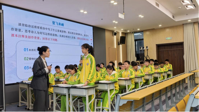 在課例展示環(huán)節(jié),宋卓文老師將傳統(tǒng)文本細讀與現(xiàn)代技術手段有機融合,借助AI生成的沉浸式畫面,引導學生跨越時空限制,切身感受陳子昂與王安石筆下的登臨意境,生動呈現(xiàn)了科技與人文教學的有效結合。同時,AI循證教研系統(tǒng)自動記錄課程實施過程中的語音、板書、行為等數(shù)據(jù)進行識別、分析和統(tǒng)計,讓課堂教學細節(jié)“清晰可見”。