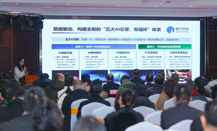 活動中,現(xiàn)代中慶圍繞“AI賦能教師專業(yè)成長”主題發(fā)表演講,闡述了人工智能正深刻改變著傳統(tǒng)教學(xué)教研模式,通過精準(zhǔn)的課堂教學(xué)過程性數(shù)據(jù)分析,能夠為教師精準(zhǔn)反思教學(xué)、為教研活動高效開展提供科學(xué)依據(jù)。