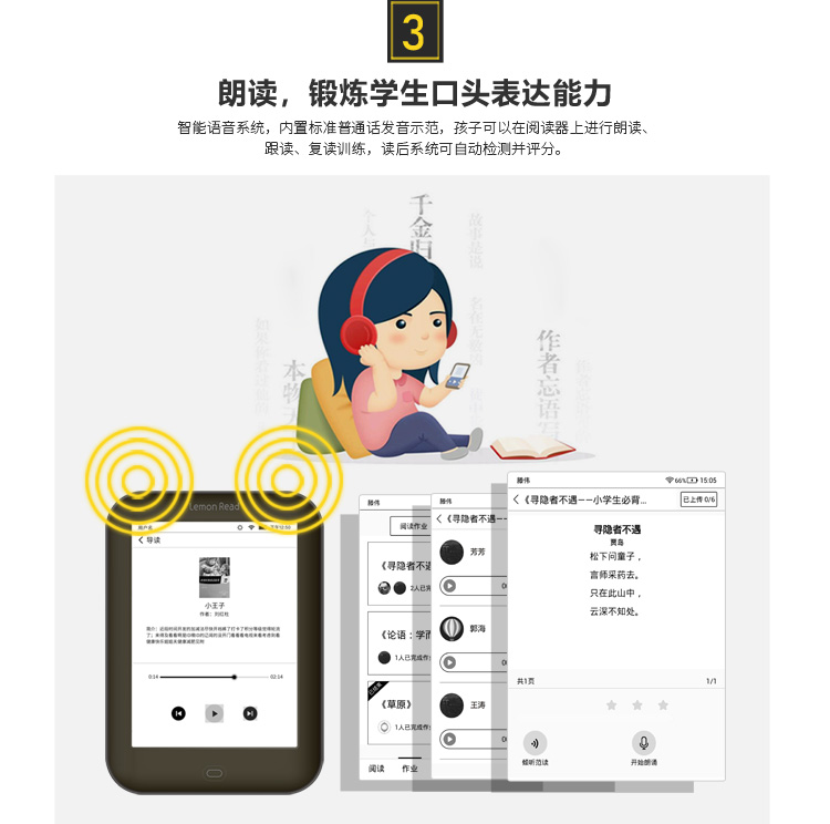 7.學(xué)生端APP系統(tǒng):完成閱讀能力評(píng)測(cè)、自由朗讀、聽書、完成朗讀作業(yè)閱讀作業(yè)評(píng)測(cè)、書圈閱讀互動(dòng)、書城、閱讀簽到等功能。