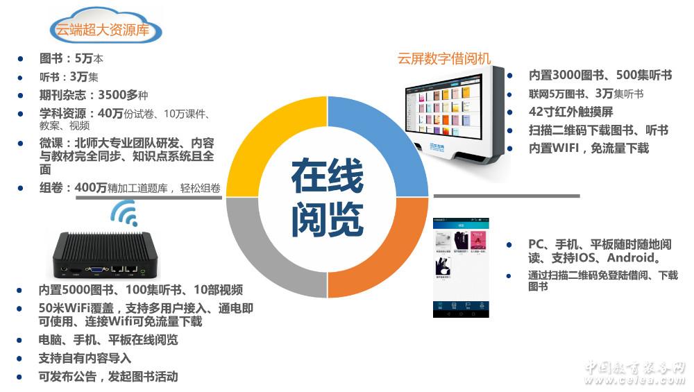 課中——課堂互動(dòng)教學(xué)系統(tǒng) 智慧課堂教學(xué)系統(tǒng)提供的課堂互動(dòng)教學(xué)系統(tǒng),是將信息化教學(xué)融入45分鐘的課堂教學(xué),兼?zhèn)渚W(wǎng)絡(luò)教與學(xué)、教學(xué)管理及溝通、通訊等全方位功能,打破傳統(tǒng)的單項(xiàng)教學(xué)模式,實(shí)現(xiàn)老師、學(xué)生、家長的互聯(lián)、互動(dòng)、互通及資源共享,提供在線備課、評測分析、文字聽寫、小組討論、文件分發(fā)、強(qiáng)化練習(xí)、資源共享等功能,打造研討式、體驗(yàn)式、混合式等創(chuàng)新教學(xué)環(huán)境。 課后——在線閱覽系統(tǒng) 智慧課堂教學(xué)系統(tǒng)提供的在線閱覽系統(tǒng),在云端超大資源庫和云屏數(shù)字借閱機(jī)的硬件與軟件相配合下為學(xué)生提供各種書籍、期刊、課件、試卷、視頻等等課外輔助學(xué)習(xí)內(nèi)容,方便學(xué)生在課后查缺補(bǔ)漏。5萬本書籍;3萬集聽書;3000種期刊;40萬份試卷、課件、教案;50萬分鐘視頻;名師微課,科學(xué)權(quán)威;動(dòng)漫課堂,寓教于樂;400萬精加工道題庫, 輕松組卷;配備賬號,任一電腦均可使用讓學(xué)生充分利用課余時(shí)間提高學(xué)習(xí)成績