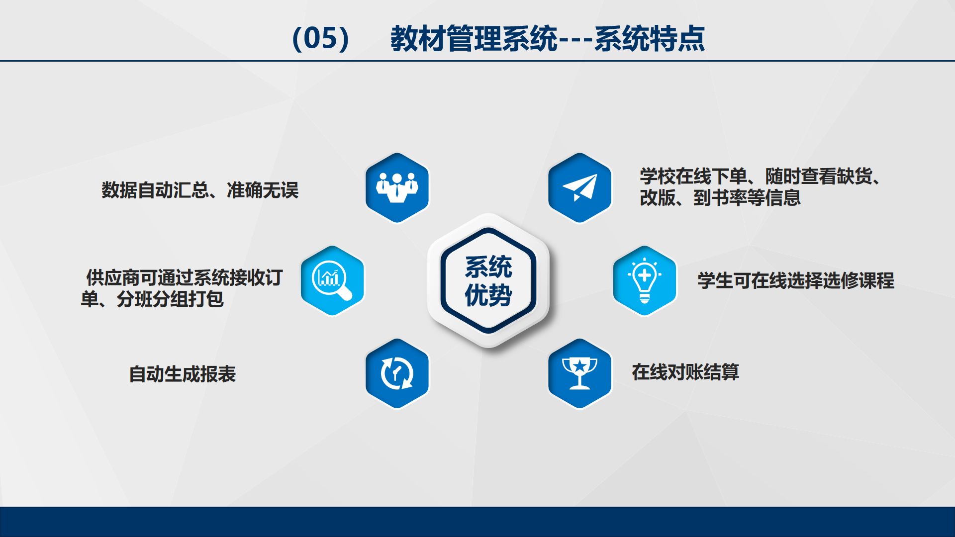 產(chǎn)品詳細(xì)介紹教材管理系統(tǒng),是以減輕學(xué)校及供應(yīng)商負(fù)擔(dān)、提高工作效率、避免差錯(cuò)為目的,實(shí)現(xiàn)了教材遴選、在線分配教材訂單、實(shí)時(shí)監(jiān)控訂單進(jìn)度、教材按校區(qū)、班級(jí)等形式分包供應(yīng)、學(xué)生可在線選擇選修課程、學(xué)生預(yù)約領(lǐng)書時(shí)間、自動(dòng)生成對(duì)賬單等功能,疫情期間,特增加了教材郵寄模塊。 |
